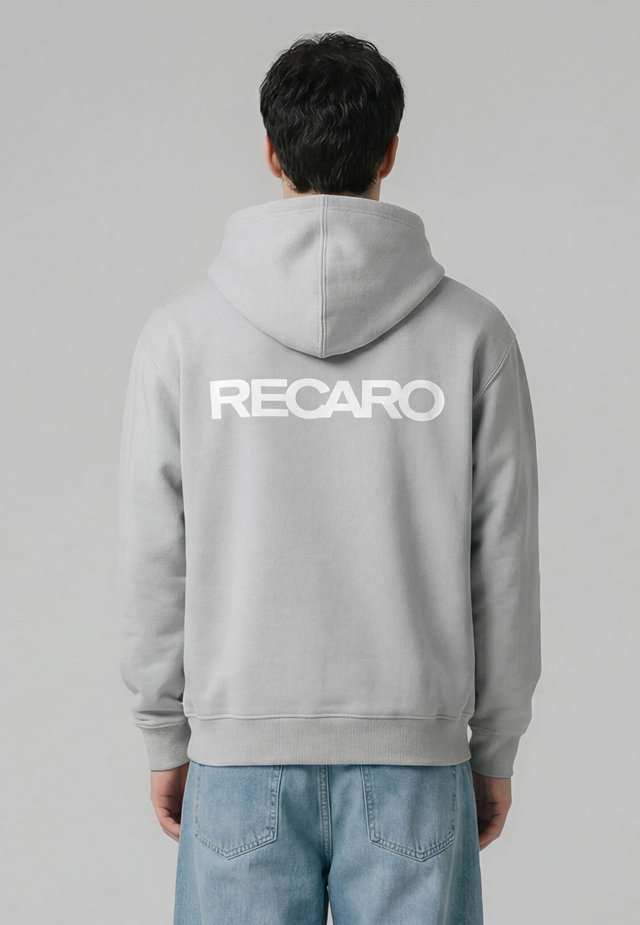 Eine Person steht mit dem Gesicht abgewandt, trägt einen hellgrauen Kapuzenpullover RECARO Heavy Cotton aus dem RECARO Shop mit dem Logo in großen weißen Buchstaben auf dem Rücken, dazu weite blaue Jeans und weiße Turnschuhe, vor einem schlichten grauen Hintergrund.
